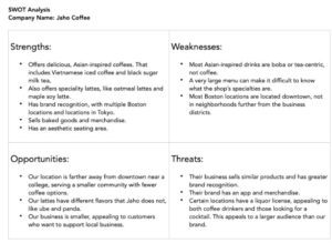 Bir SWOT analizi, markanızı pazarınızda daha iyi konumlandırmanıza yardımcı olabilir. Kahve dükkanımız için, Boston’daki Asya esintili başka bir kahve dükkanı olan Jaho’da bir SWOT analizi yapalım.