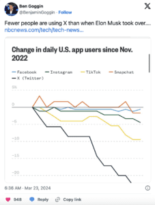 Sensor Tower’ın araştırmasına göre, ilk kez NBC News tarafından bildirildiği üzere , X “emsallerine kıyasla aktif kullanıcılarda en önemli düşüşü yaşadı.”