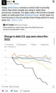 Musk’ın platformu, Sensor Tower’ın bulgularını ve NBC News raporunu, resmi bir X hesabı olan @XData tarafından yayınlanan bir kamu açıklaması aracılığıyla ele aldı.