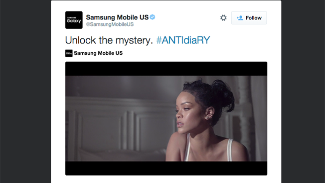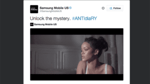 Bu ortak içerik kapsamında Rihanna sosyal medya hesapları üzerinden milyonlarca takipçisine Samsung telefonlarının tanıtımını yapıyor. Zaten Rihanna gibi 81 milyon Facebook, 55 milyon Twitter ve 32 milyon Instagram takipçisi olan biri varken geleneksel medya pazarlamasına kim ihtiyaç duyar ki? Hem de Rihanna 2016 yılının başında NPD Group adlı araştırma merkezine göre dünyanın en çok pazarlanabilir ünlüsü olarak belirlenmişken.