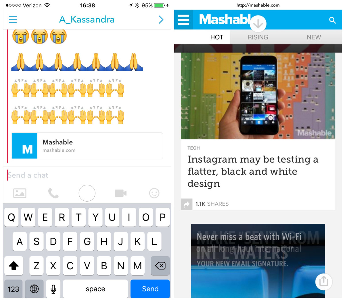 Sohbet sırasında konuştuğunuz kişi ile link paylaşabiliyor ve link’e basıp uygulamadan çıkmadan siteye yönlendiriliyorsunuz. Link ile işiniz bittiğinde sol üst köşedeki Snapchat yazısına tıklayıp uygulamaya geri dönebiliyorsunuz.