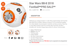 BB-8 motifli resmi maç topu 24.99 AUD olarak satılıyor