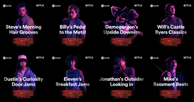 Spotify, kullanıcılarının müzik zevklerine göre dizi karakterlerinin dinleyebileceği playlistleri (“playlistleri” link https://www.spotify-strangerthings.com/) öneriyor. 13 karakterin kişilik özelliklerine göre tasarlanan playlistler, dinleyicilerine Hawkins kenti ve Upside Down World (Baş Aşağı Dünya) deneyimini yaşatıyor. Playlistler, 80’ler synth parçalarından pop’a bir çok mod barındırıyor.