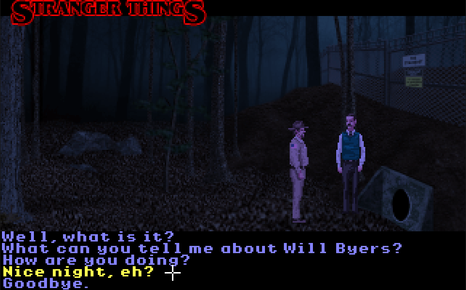 1984 yılıydı, oyunlar 8-bit’ti. Tıpkı karakterlerin günümüzde oynayacakları “Legend of Zelda” tipi aksiyon macera oyunu gibi. Bu aplikasyon oyuncuyu, Mirkwood Ormanı’nı çalılarından, esrarengiz Hawkins Labartuarı’na kasabanın çeşitli noktalarında keşfe çıkarıyor.