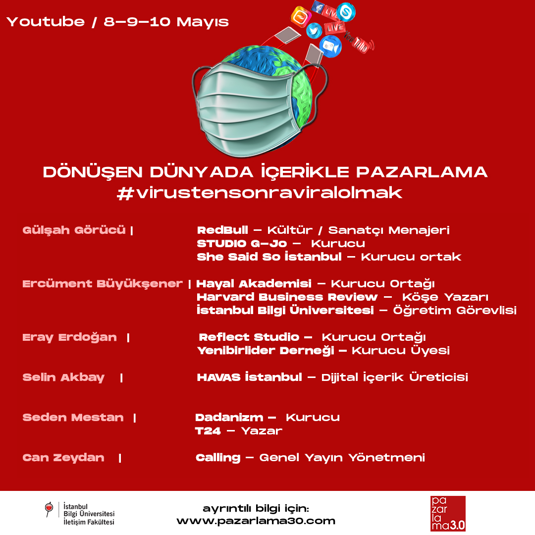 Bu yıl beşincisini düzenlediğimiz ama ilk kez dijital ortamda gerçekleştirdiğimiz İçerikle Pazarlama Konferansı 2020 oturumlarını 8-9-10 Mayıs tarihlerinde bu sayfadan veya doğrudan Youtube kanalımızdan izleyebilirsiniz. Konferans programını aşağıda bulabilirsiniz.