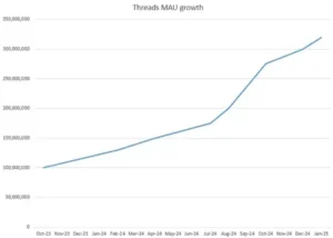 Ocak 2025’te Meta CEO’su Mark Zuckerberg, Threads’in aylık 320 milyon aktif kullanıcıyı aştığını açıkladı. Backlinko tarafından paylaşılan veriler de bu büyümeyi doğruluyor: