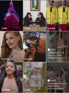 Gucci, hazır giyim, çanta, ayakkabı, makyaj ve koku yapan İtalyan lüks moda markasıdır. TikTok’ları yeni koleksiyonları tanıtmak için kısa filmlerle, giysilerin nasıl yapıldığını gösteren kamera arkası görüntülerle ve parçalarını giyen ünlü yüzlerle dolu. Daha lüks ve profesyonel içeriği paylaşıyorlar, ancak yine de platformun ünlü olduğu kısa biçimli videolara ve geçişlere uyum sağlıyorlar.