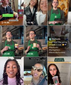Starbucks, ünlü frappe içecekleri ve mevsimlik kahve karışımlarıyla tanınan, birçok ülkede kahve zinciri olan bir markadır. Ünlü yüzler ve eğlenceli geçiş videoları ile yeni lezzetleri duyurarak TikTok’tan en iyi şekilde yararlanıyorlar. Ayrıca, komik ve ilişkilendirilebilir videolar hazırlamak için baristalar ile röportajlar yaparak ve ilgili trendleri takip ederek kahve yapma konusundaki uzun yıllara dayanan deneyimlerini sergiliyorlar.