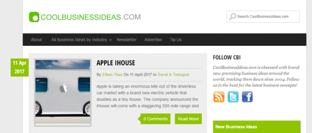 CoolBusinessIdeas.com, iş fikirlerini yönlendirmek isteyen gözü doymaz tüm iş insanları için vaz geçilmez bir platform. Web sitesi Trend Hunter kadar havalı gözükmese de tüketim malları, medya ve yayımcılık, moda ve tasarım gibi pek çok konuda trendi ücretsiz olarak aktarıyor.