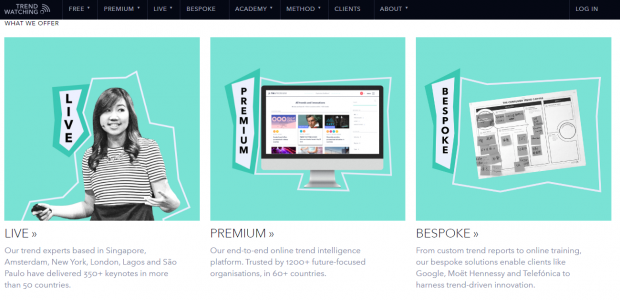 Bu web sitesi, sık kullanılan ürünler ve kampanyalar oluşturmanıza yardımcı olabilecek araçlar, bilgiler ve trendler içeriyor. Trend Watching, trend uzmanlarıyla canlı görüşmeler yapmanız içinde bir fırsat sunuyor. Sitenin ücretsiz üyelik seçeneği olsa da daha detaylı bilgiler edinmek isteyenler için aylık 499 $ gibi bir ücrete üye olabiliyorsunuz.