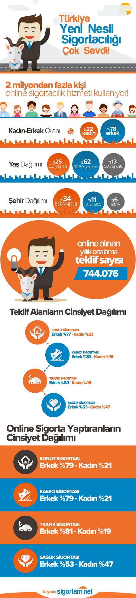 Türkiye’de online ve telefon üzerinden sigorta satışı ve karşılaştırması hizmeti sunan ilk şirket olma özelliğini taşıyan Sigortam.net’ten teklif alan müşterilerin yüzde 34’ü İstanbul’da, yüzde 11’i Ankara’da ve yüzde 6’sı İzmir’de yaşıyor. Geri kalan yüzde 49 ise üç büyük il haricinde Türkiye geneline dağılmış durumda.
