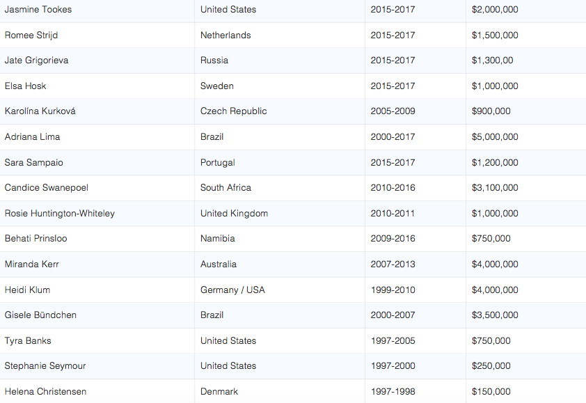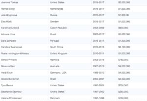 Bu arada Victoria’s Secret’tan önce sıradan hayatları olan bu modeller markayla yaptıkları anlaşmalarla hayat kalitelerini arttırıyorlar. Aşağıdaki tablo modellerin isimlerini, ülkelerini, kontrat dönemlerini ve senelik ücretlerini sergiliyor. Bir göz atmakta fayda var.
