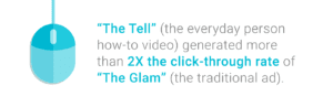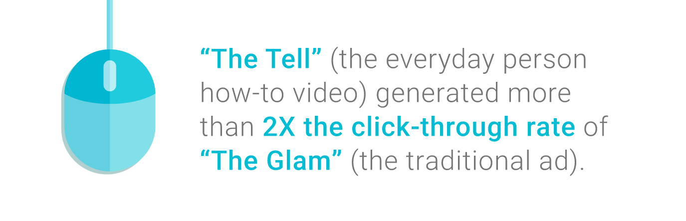 Görünen o ki tüketiciler video reklamları ile harekete geçmekten mutlu oluyorlar. Bu örnekte, kullanıcı tarafından üretilen içeriğe sahip videolar daha çok tıklanıyor. Eğer markanızın başarı hedefi tıklanma odaklı ise basit konuşmalı ve direkt çekim stili kullanmayı düşünmelisiniz.