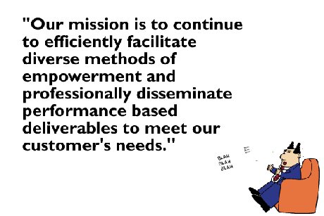 Aslında ayrı ayrı cümleler olması gerekirken, birbiri ardına bağlanmış bir türlü bitemeyen ve bitmeyecekmiş gibi duran cümlelerden oluşan vizyon ifadeleri, genellikle şöyle bir akış gösteriyor: “Vizyonumuz, şunu şunu şunu yaparak, bunu bunu kullanarak ama şunları da göz önüne alarak böyle böyle bir şey olmaktır!” Bu ifadeler o kadar basmakalıp hale geldi ki, internette bunlarla dalga geçen ve Scott Adams’ın ünlü çizgi karakteri Dilbert’ten esinlenen “mission statement generator” ve “vision statement generator” siteleri bulunuyor.