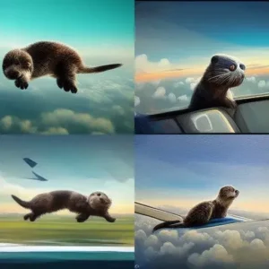 Mollick bu komutu kullanarak, uçakta Wi-Fi kullanan bir su samurununun görsellerini oluşturuyor. İşte Kasım 2022 civarında bir üretici yapay zekâ görsel aracından aldığı sonuçlar.