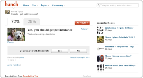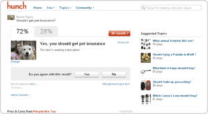 • Fotoğraf paylaşım sitesi Flickr’ın kurucusu Caterina Fake liderliğindeki çevrimiçi bir karar verme aracı Hunch, kullanıcıların sorduğu rastgele sorulara yine kullanıcıların verdiği yanıtları anket haline dönüştürüyor ve çevrimiçi olarak kullanıcılarına sunuyor. Örneğin; “Ben tıp okuluna gitmeli miyim?” gibi kişisel ve karmaşık sorulara cevap arıyorsanız, aynı kaderi paylaşan insanların cevapları veya yorumlarını karşılaştırılabilir şekilde elde edebiliyorsunuz.