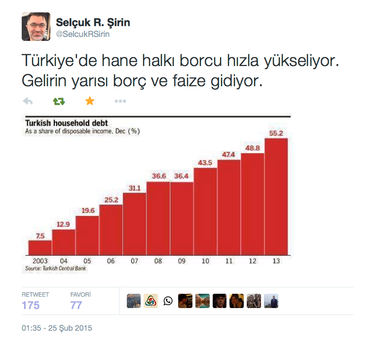 Yunanistan’a bıyık altından gülen Türkiye’ye baktığımızda da büyük bir hızla borç yemeye devam ettiğimizi görüyoruz. McKinsey’in hesaplamalarına göre, borcun hane gelirine oranı 2007’de yüzde 15 iken 2014’te yüzde 29 düzeyine yükselmiş. Bu oran tehlikeli sınırın altında gibi görünse de geçtiğimiz günlerde New York Üniversitesi öğretim üyesi Selçuk Şirin‘in Merkez Bankası verilerine dayanarak Twitter hesabından yayınladığı verilere göre, Türkiye’de net (harcanabilir) hane geliri içindeki borç oranı çok daha dramatik bir şekilde artıyor. 2003’te yüzde 7,5 olan hane borcunun net hane gelirine oranı 2013’te yüzde 55,2‘ye yükselmiş durumda.